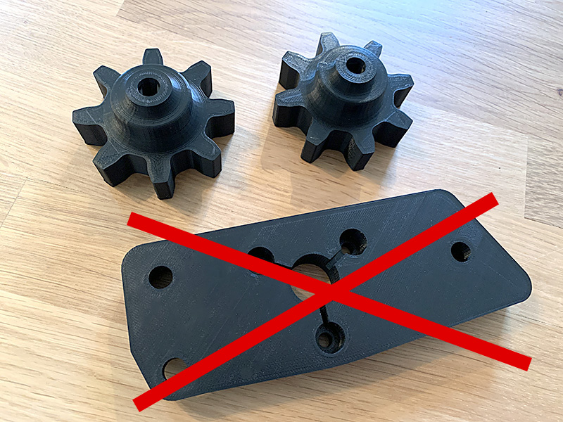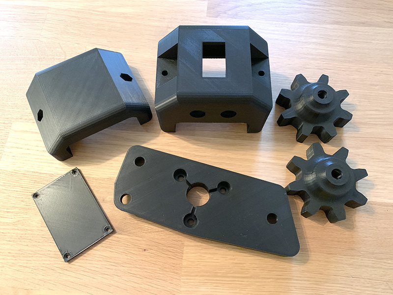 You get the PLA drive gear, the PLA mounting plate, the ROPS-mounted switch housing (for 2x3 steel tubing ROPS), and 1 spare PLA drive gear.