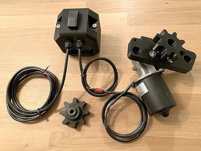 You get the PLA drive gear, the PLA mounting plate, the ROPS-mounted switch housing (for 2x3 steel tubing ROPS), 1 spare PLA drive gear, drive motor, switch, all wiring, connectors, and hardware.